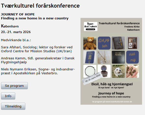 Teamet for året efterårskonference er: "Giv håbet stemme". i programmet skriver Tvækulturelt Center om konferencen: "Gud er håbets Gud. Det har til alle tider været den kristne kirkes budskab. Hvad betyder det for...[mere]